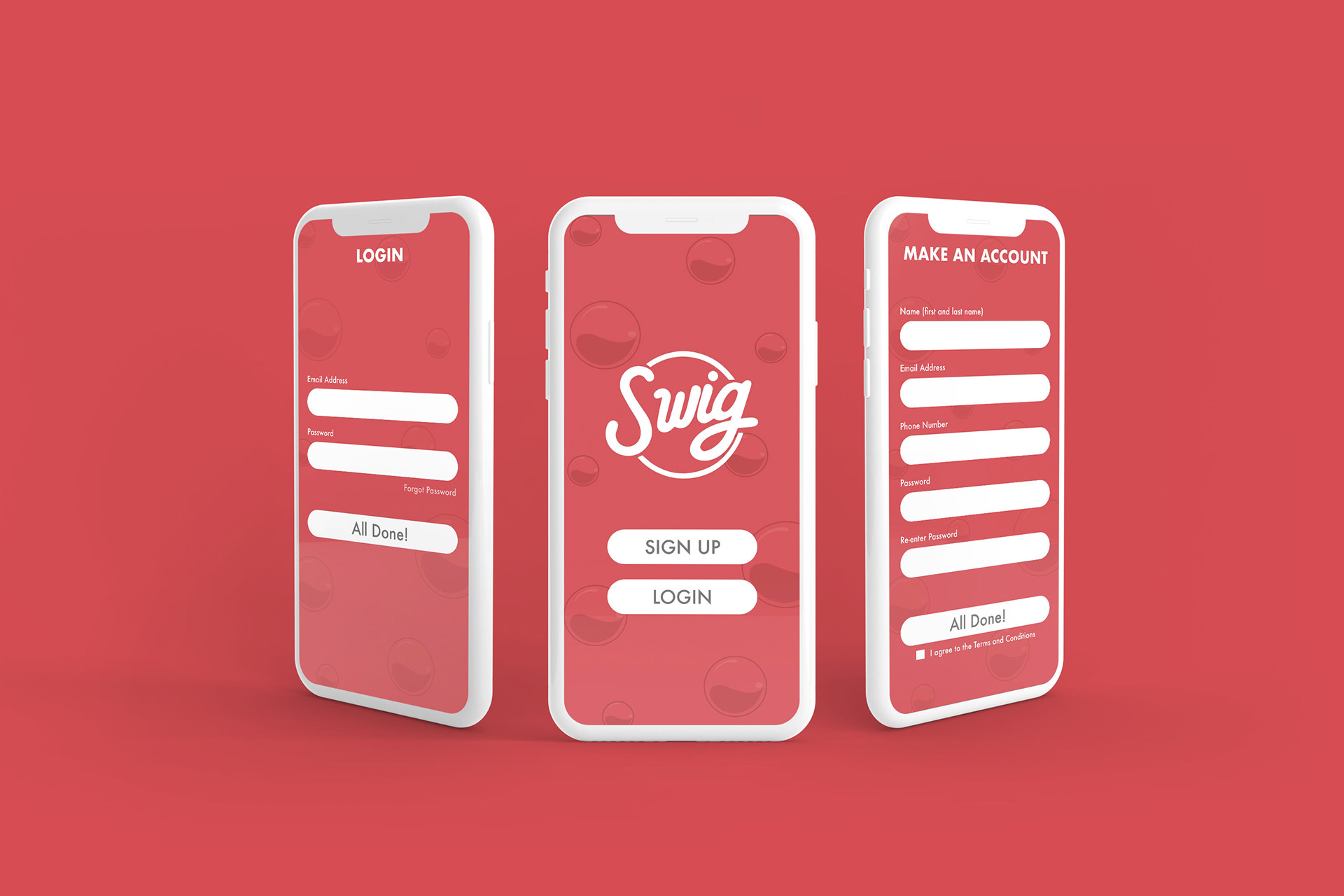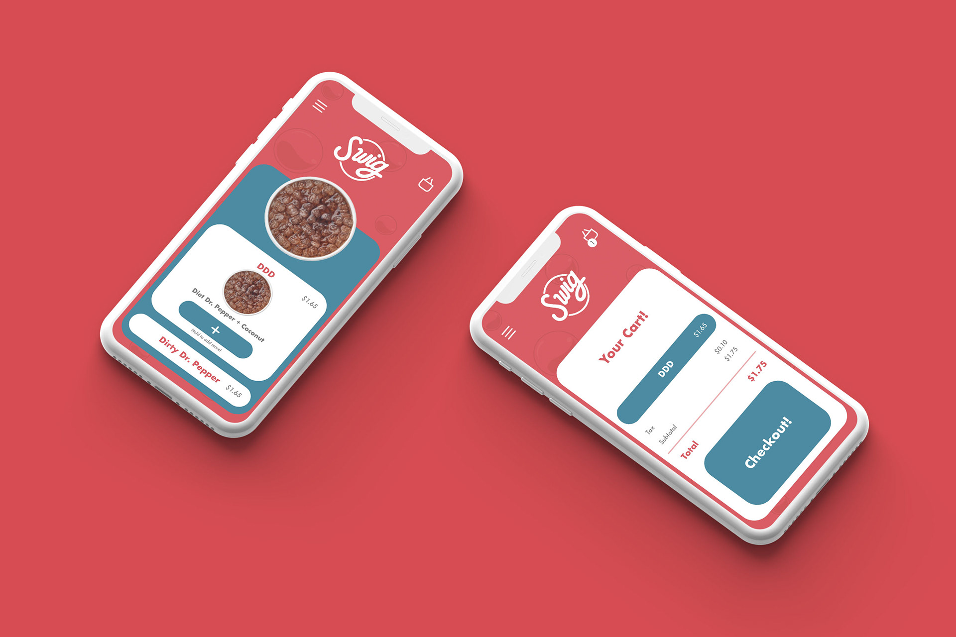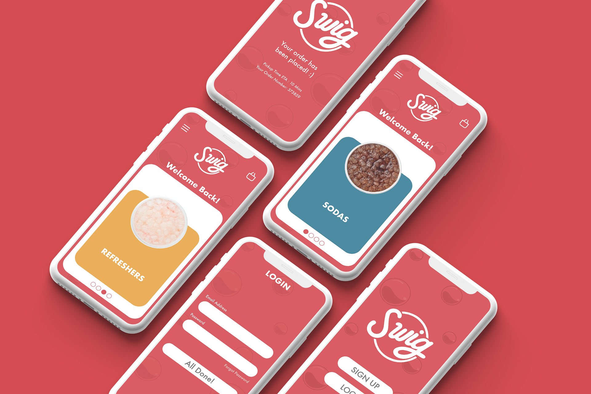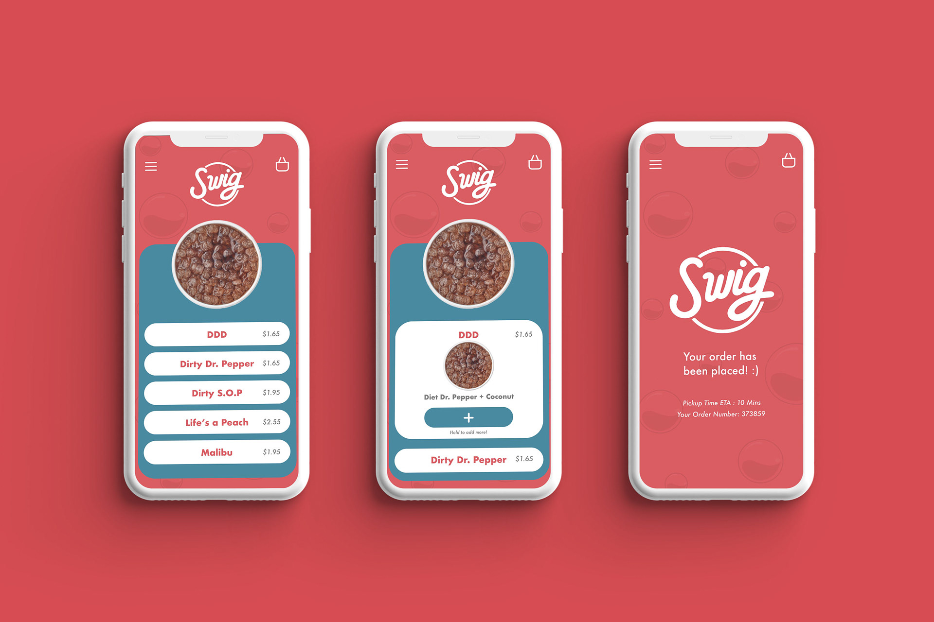 A concept mobile ordering app for the popular drink stop, Swig. Existing imagery such as the logo, imagery, and color palette all came from the original branding.